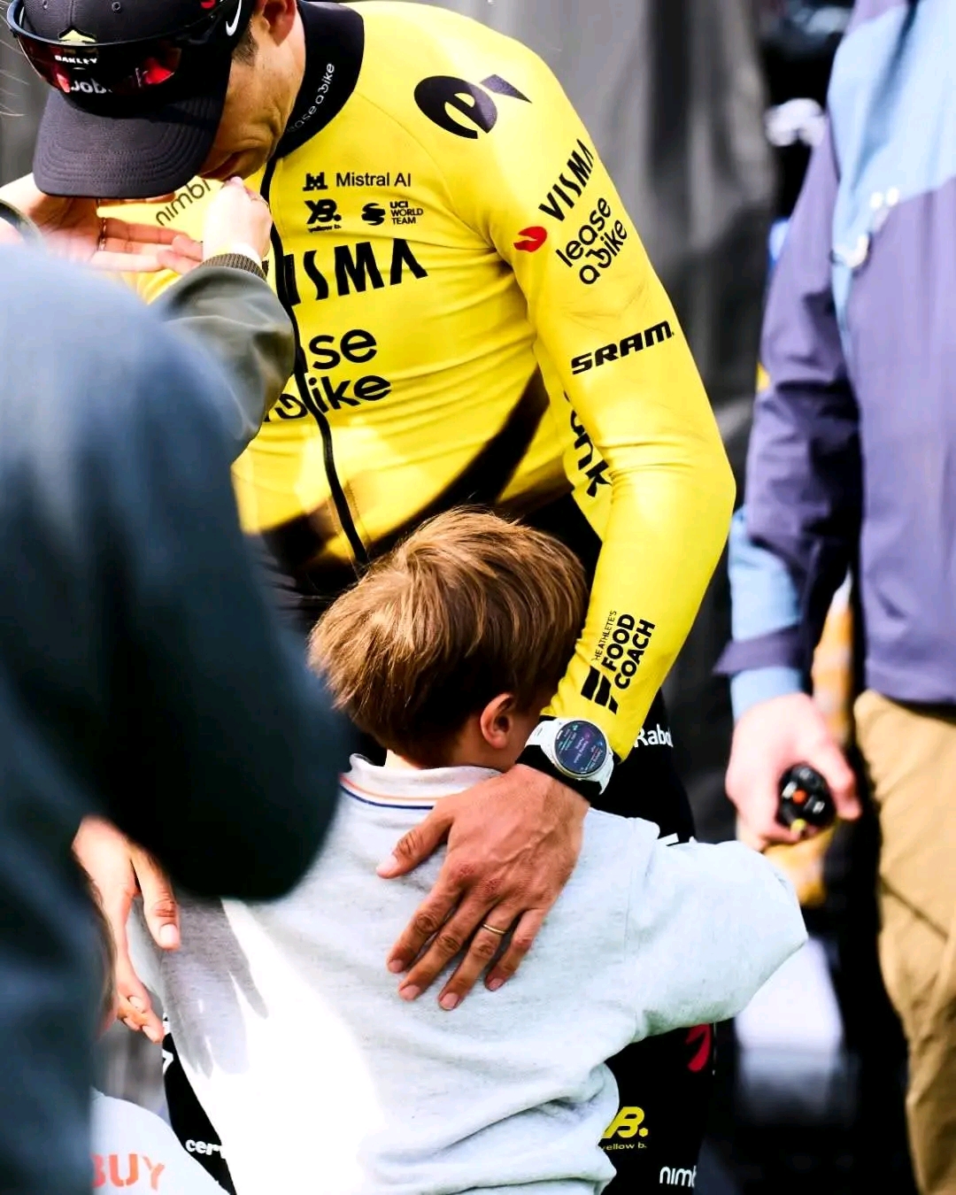 ROUBAIX, FRANCE – APRIL 12: Race winner Wout van Aert of Belgium and Team Visma | Lease a Bike celebrates at finish line with his family after the 123rd Paris-Roubaix Hauts-de-France 2026 – Men’s Elite a 258.3km one day race from Compiegne to Roubaix / #UCIWT / on April 12, 2026 in Roubaix, France. (Photo by Rhode Van Elsen/Getty Images)