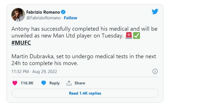 Fabrizo Romano Announced Antony Medical