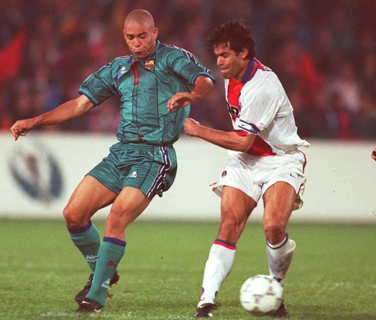 Barcelona experimented with its 1995–96 away kit, which was designed by Kappa. It had a geometric sort of stripe pattern in various blue colors, red and blue accents, Kappa’s recurrent emblem along the sleeves, and a royal blue completed collar. To argue that it was light blue would be to miss the point. The repetitive pattern running down it, which featured the Kappa emblem and the word “Barca,” might have been the oddest aspect of the away kit.